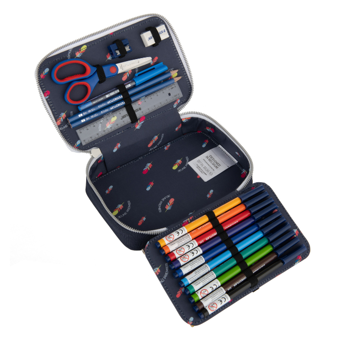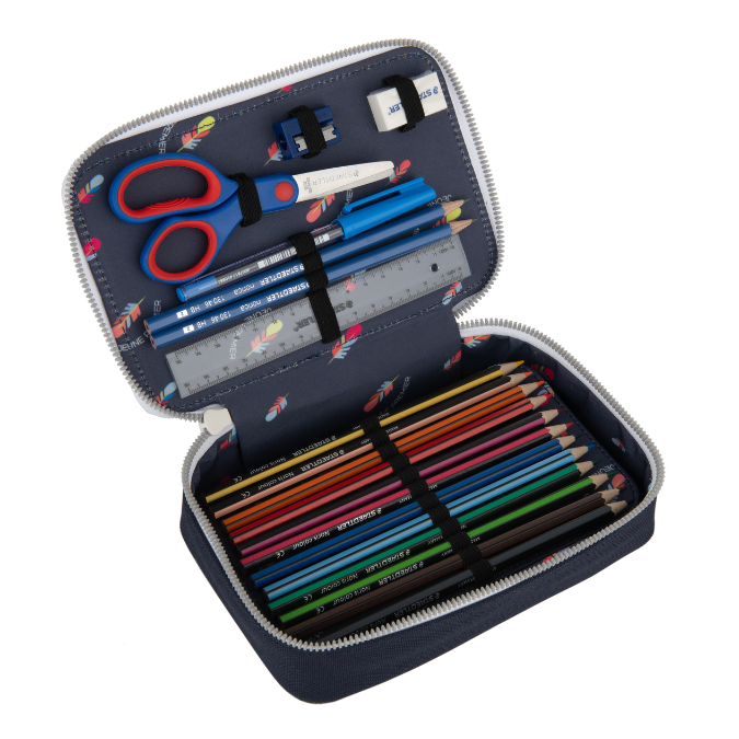 Inhalt: 12 Buntstifte, 10 Filzstifte, 2 Bleistifte, 1 Radiergummi, 1 Spitzer, 1 Lineal,1 Schere, 1 Kugelschreiber.