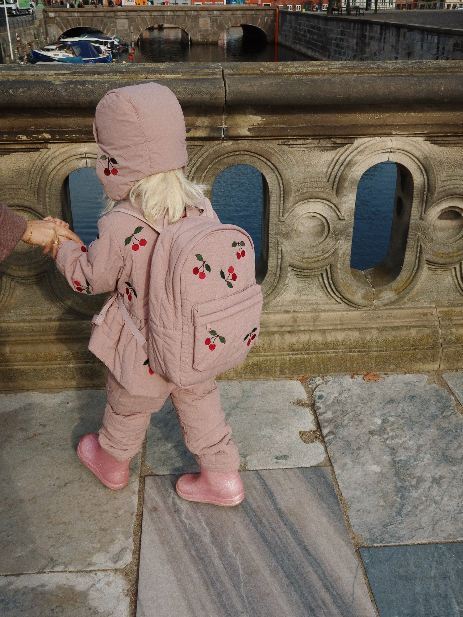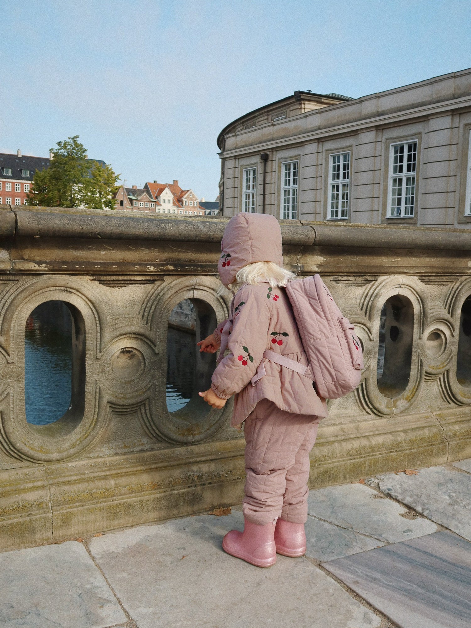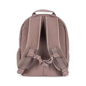 Weicher und leichter Rucksack "Juno Midi" Twilight Mauve von Konges Sløjd mit einer praktischen Flaschentasche, Vordertasche und einem Brustgurt zur Unterstützung des Rückens.
