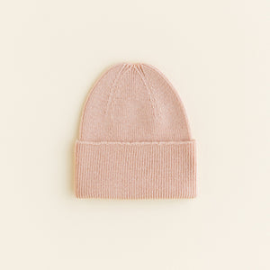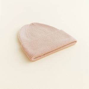Wunderschöne handgestrickte und sehr weiche Strickmütze "Fonzie" von Hvid. Hergestellt aus feinster Merinowolle. Im Rippstrick gefertigt hat sie die perfekte Passform für das Neugeborene.