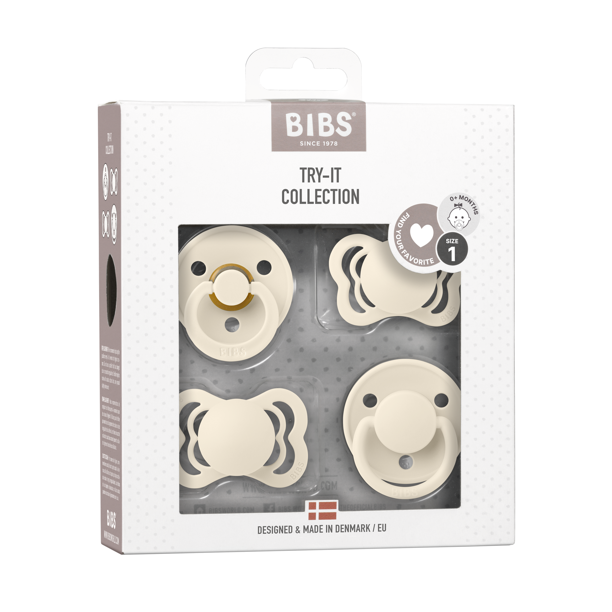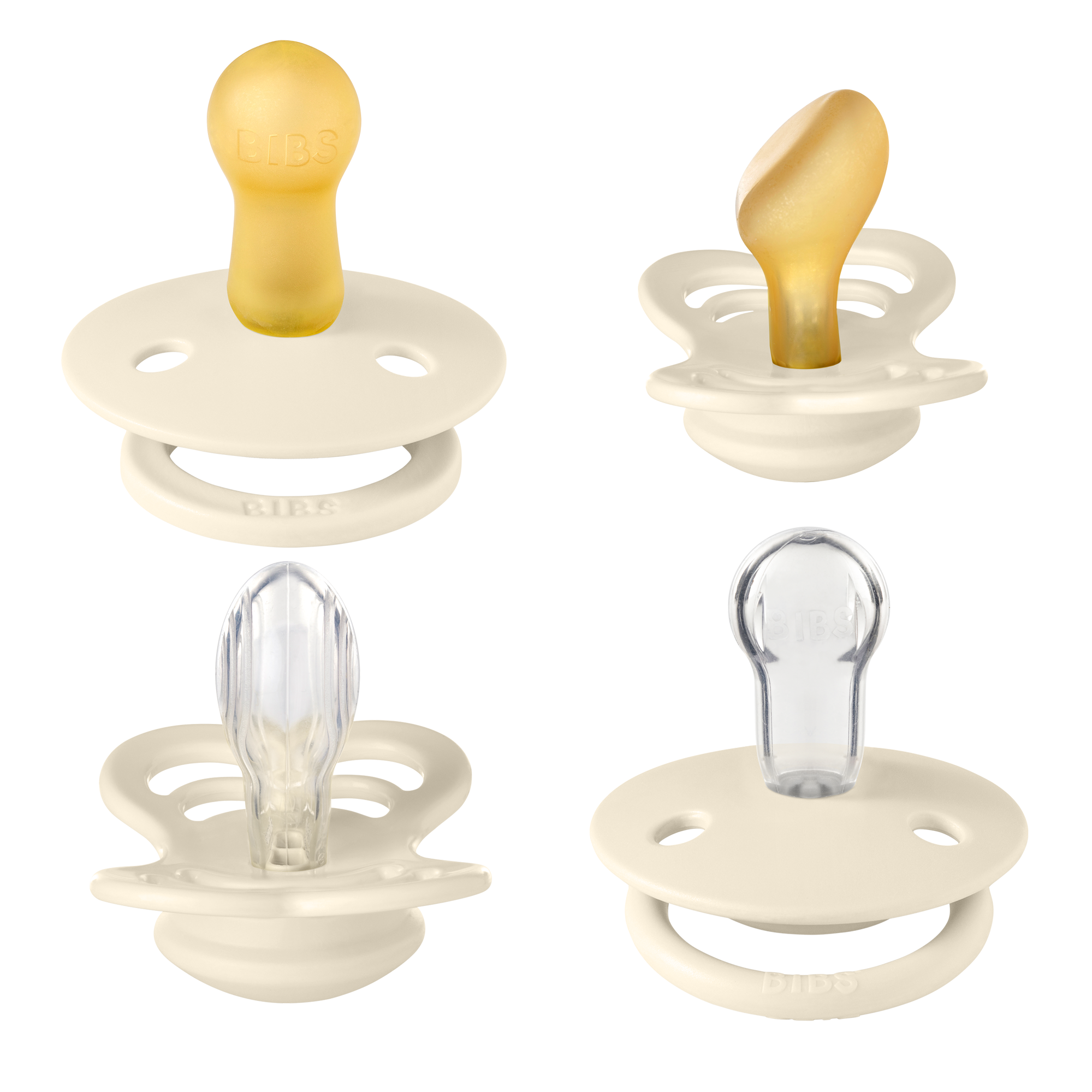 BIBS Try-It 4er-Pack Ivory: 4 Schnuller, 3 Nippelformen & 2 Materialien.