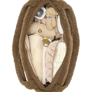 Die Studio Noos Wickeltasche "Teddy" in Braun verbindet kuschelig weiches Design mit alltagstauglicher Funktionalität. Ob am Kinderwagen oder über der Schulter – diese stylische Mom Bag bietet genügend Platz für alles, was du und dein Kind unterwegs brauchen: Windeln, Snacks, Fläschchen, Bücher und mehr.