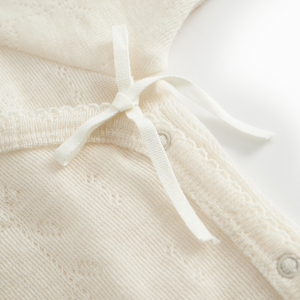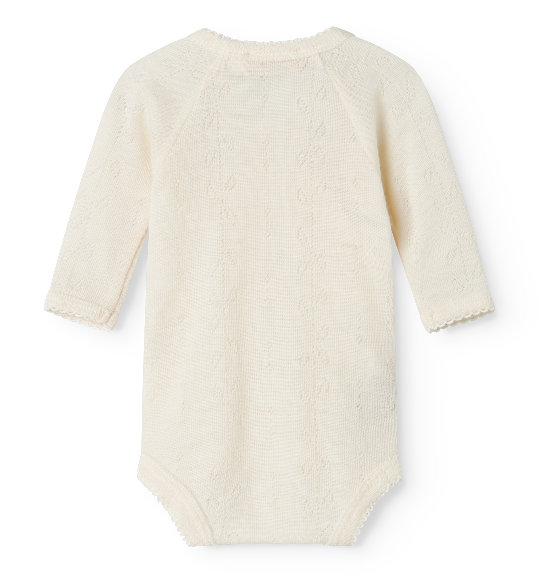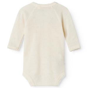 Wunderschöner und sehr weicher Wickel-Langarmbody im Pointelle-Muster in Natural von Marmar Copenhagen.