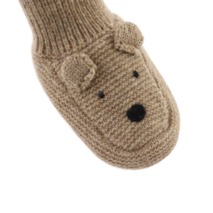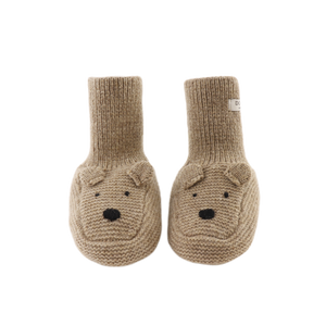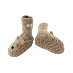 Babyschuhe „Maicer Merino Wool Booties“ von Donsje Amsterdam in Milk Chocolate Melange mit Bärenohren – extra warm und weich für Neugeborene.