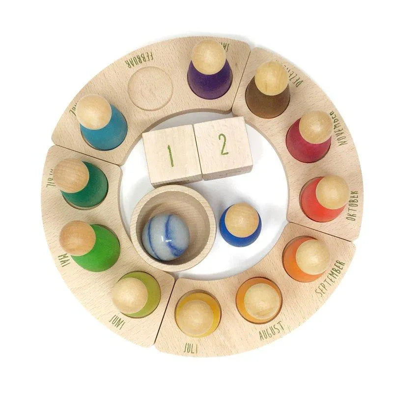 Der Ewige Kalender von Grapat ist ein wunderschön gestaltetes Holzspielzeug, das Kindern auf einfache und anschauliche Weise das Konzept von Zeit und Jahresrhythmen näherbringt. Mit 12 farbigen Nins® für die Monate und 31 Zahlenplättchen für die Tage eignet sich der Kalender perfekt zur täglichen Orientierung und als Ritual im Familienalltag oder Klassenzimmer.