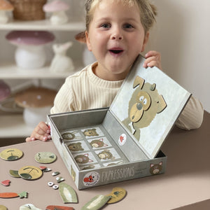 Bär, Fuchs, Hund oder Kaninchen? Wie fühlen sie sich heute Morgen? Glücklich, traurig, verträumt, neugierig, hungrig … Gestalten Sie ihre Gesichter mit den 47 magnetischen Teilen. Die hübsche Magnetbox erleichtert das Spielen und ist praktisch, um alle Elemente aufzubewahren und das Spiel überallhin mitzunehmen!