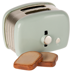 Maileg Toaster für Mäuse in Mint mit Miniatur-Toasts als Puppenhaus-Zubehör.