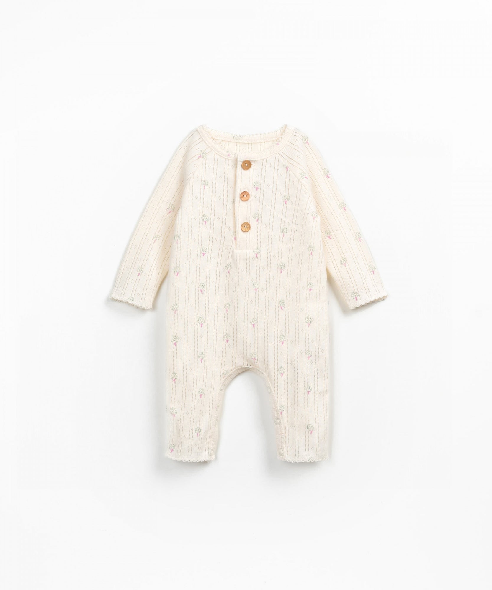 Dieser Overall von Play Up hergestellt aus Bio-Baumwolle und recycelter Baumwolle. Das Modell hat einen Rundhalsausschnitt, eine vordere Öffnung mit Kokosnussknöpfen, eine Schrittöffnung mit nickelfreien Metalldruckknöpfen und süssem Print.