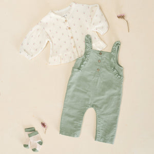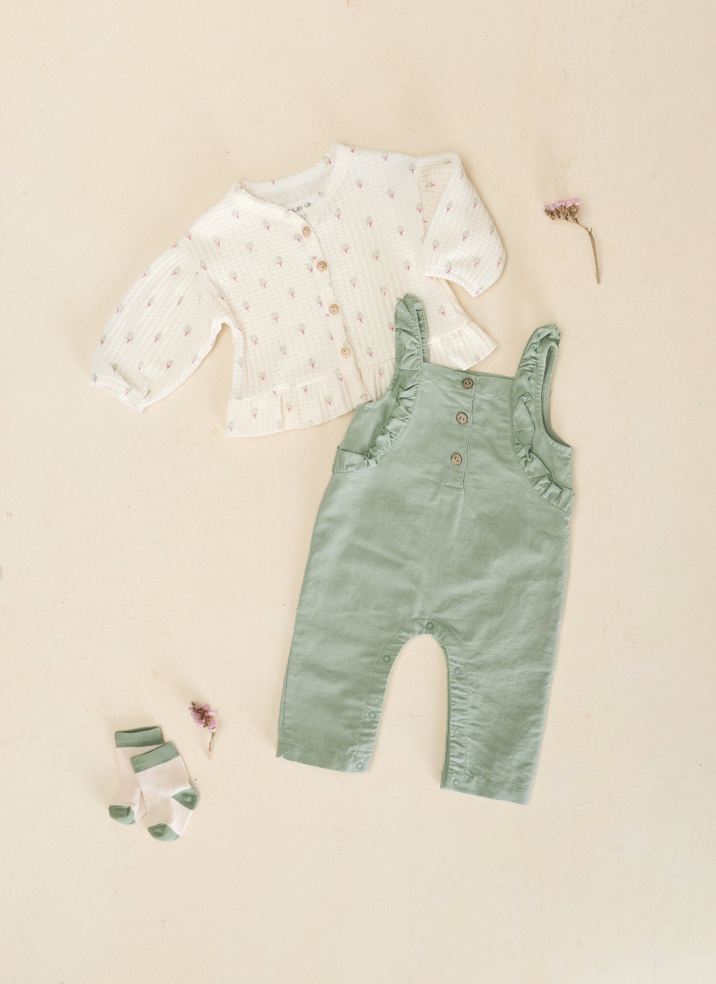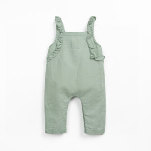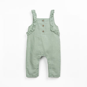 Coole Hose von Play Up, verziert mit hübschen Rüschen an den Trägern und Vorderteil. Eine Knopfleiste mit Bambusknöpfen und eine Schrittöffnung mit nickelfreien Metalldruckknöpfen (Schrittöffnung bis Größe 18M).