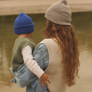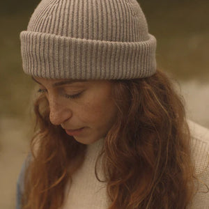Wunderschöne handgestrickte und sehr weiche Strickmütze "Fonzie" für Erwachsene von Hvid. Hergestellt aus feinster Merinowolle. Im Rippstrick gefertigt hat sie die perfekte Passform.