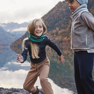 Weicher Merino Loop-Schal "Birkin" Emerald Dark Blue von minimalisma mit Rüschen und kontrastierenden Nähten.