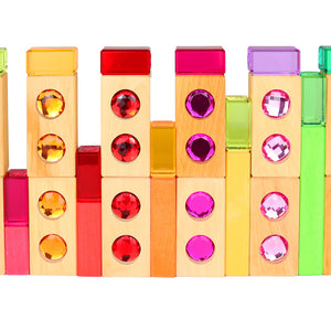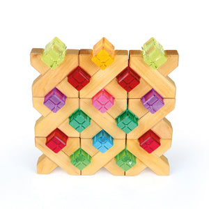 Bauspiel Set aus 24 transparenten Bauspiel Lichtbauquadern, verpackt in einer praktischen Holzbox.