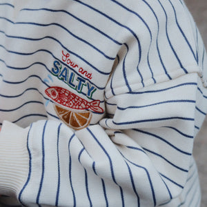 Cooles Sweatshirt 'Amio' mit einem maritimen Streifenmuster und verspielten Stickdetails auf der Brust von Konges Sløjd. Das Sweatshirt mit bequemer Passform ist aus 80% weicher Bio-Baumwolle gefertigt und bietet deinem Kind einen hohen Tragekomfortwährend des ganzen Tages.