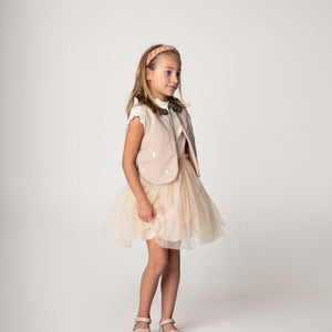 Der Rock „Pien Skirt“ von Donsje Amsterdam in Soft Powder Metallic ist ein leichtes, verspieltes Kleidungsstück mit besonderer Ausstrahlung. Der sanft fallende Tüll und das weiche Baumwollfutter machen ihn zu einem bequemen Begleiter für Kinder im Alltag und bei besonderen Anlaessen. Der elastische Bund sorgt fuer einen sicheren Sitz ohne Einengen. Mit seinem dezenten Glanz wirkt der Rock besonders edel – und passt zu schlichten wie festlichen Outfits. Wie alle Donsje Produkte ist auch dieses Modell handmade & fairtrade gefertigt.
