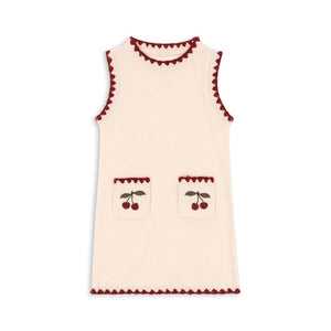 Wunderschönes Strickkleid aus weicher Wolle mit feinem Kirschstickerei-Detail – perfekt für besondere Anlässe und kalte Tage.