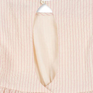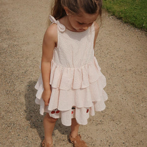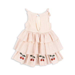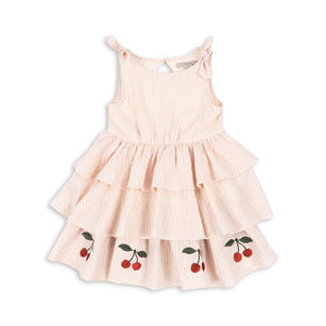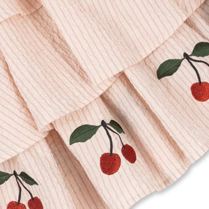 Wunderschönes Seersucker-Kleid 'Peony Stripe' mit mehrlagigem Rock und Kirschstickerei von Konges Sløjd. Mit Rückenausschnitt und Kirschendetails.