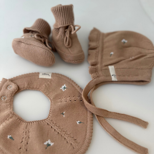 Weiche gestrickte Baby-Schühchen mit Stickerei von Saga Copenhagen aus 100 % zertifizierter Bio-Baumwolle gefertigt.