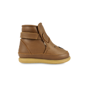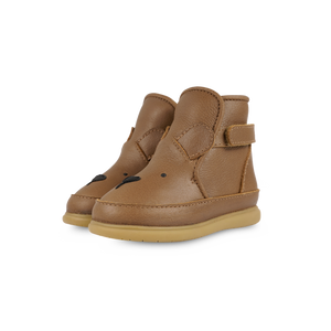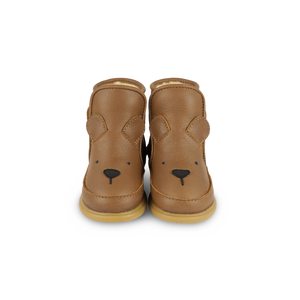 Winterstiefel „Dubu Classic Shoes“ von Donsje Amsterdam in Cognac Classic Leather mit Bärenmotiv – warm gefüttert und ideal für kältere Tage.