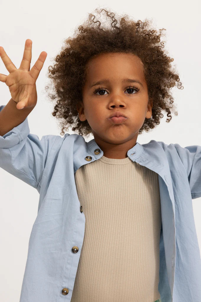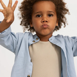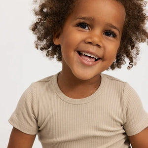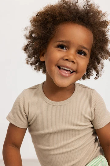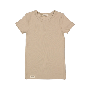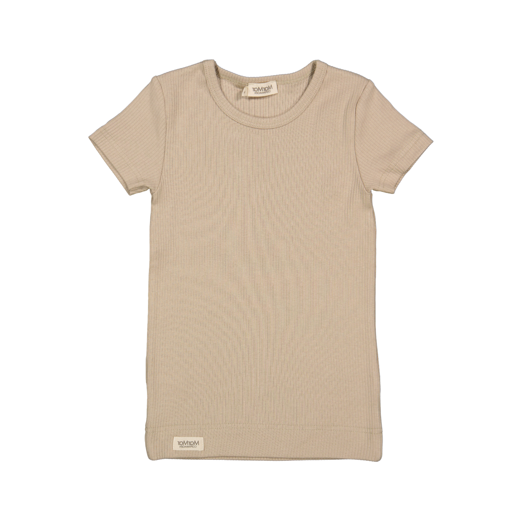 Superweiches Feinripp T-Shirt SS - Stone Wall von MarMar Copenhagen mit kurzen Ärmeln. Das T-Shirt ist rippengestrickt, weich, form- und farbbeständig und enthält Elastan, wodurch es dehnbar und angenehm zu tragen ist