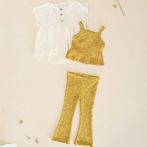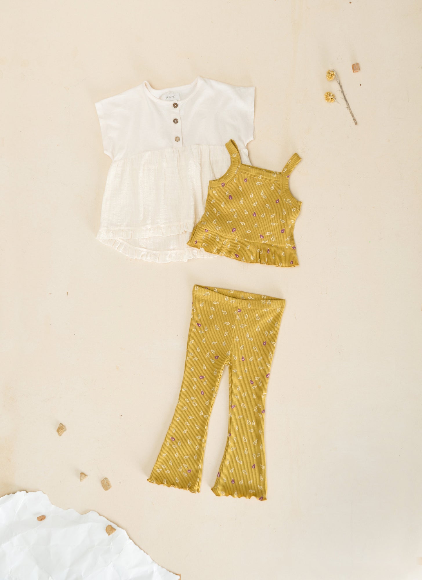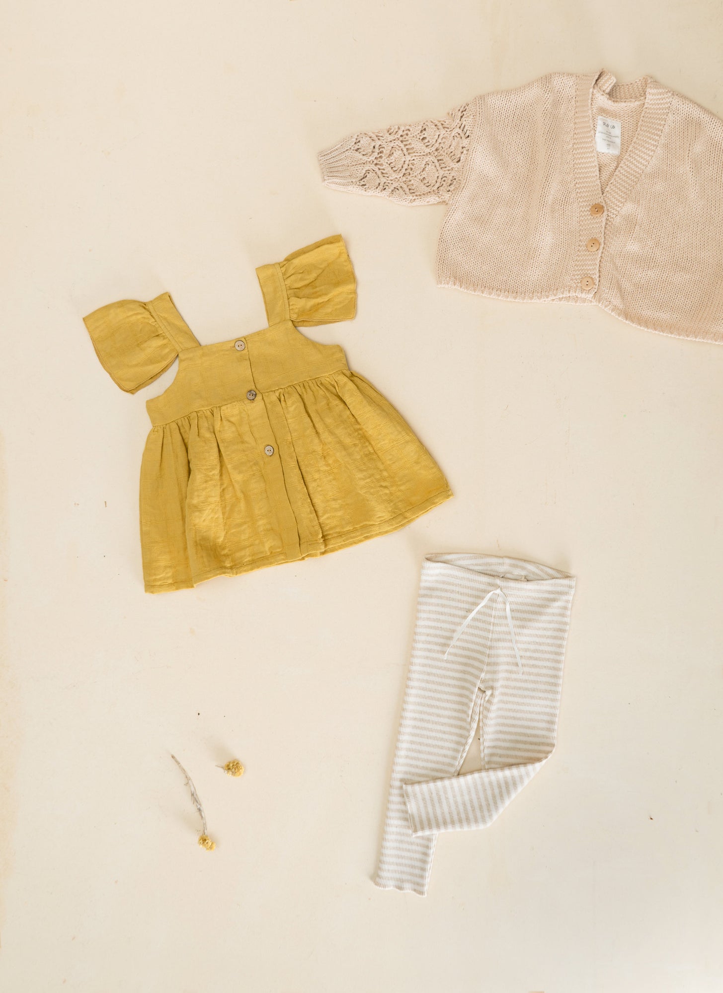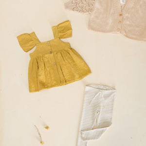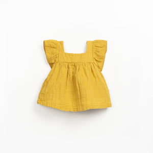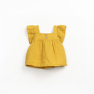Süsse Tunica aus Baumwolle und Leinen von Play Up. Verziert mit hübschen Rüschen an der Schulternaht und zwei Bambusknöpfen am Vorderteil.