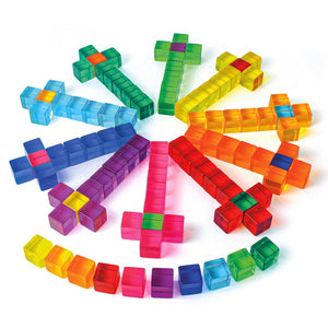 Bauspiel Lichtbauwürfel Set mit 100 farbigen, transparenten Bausteinen.