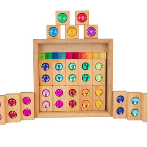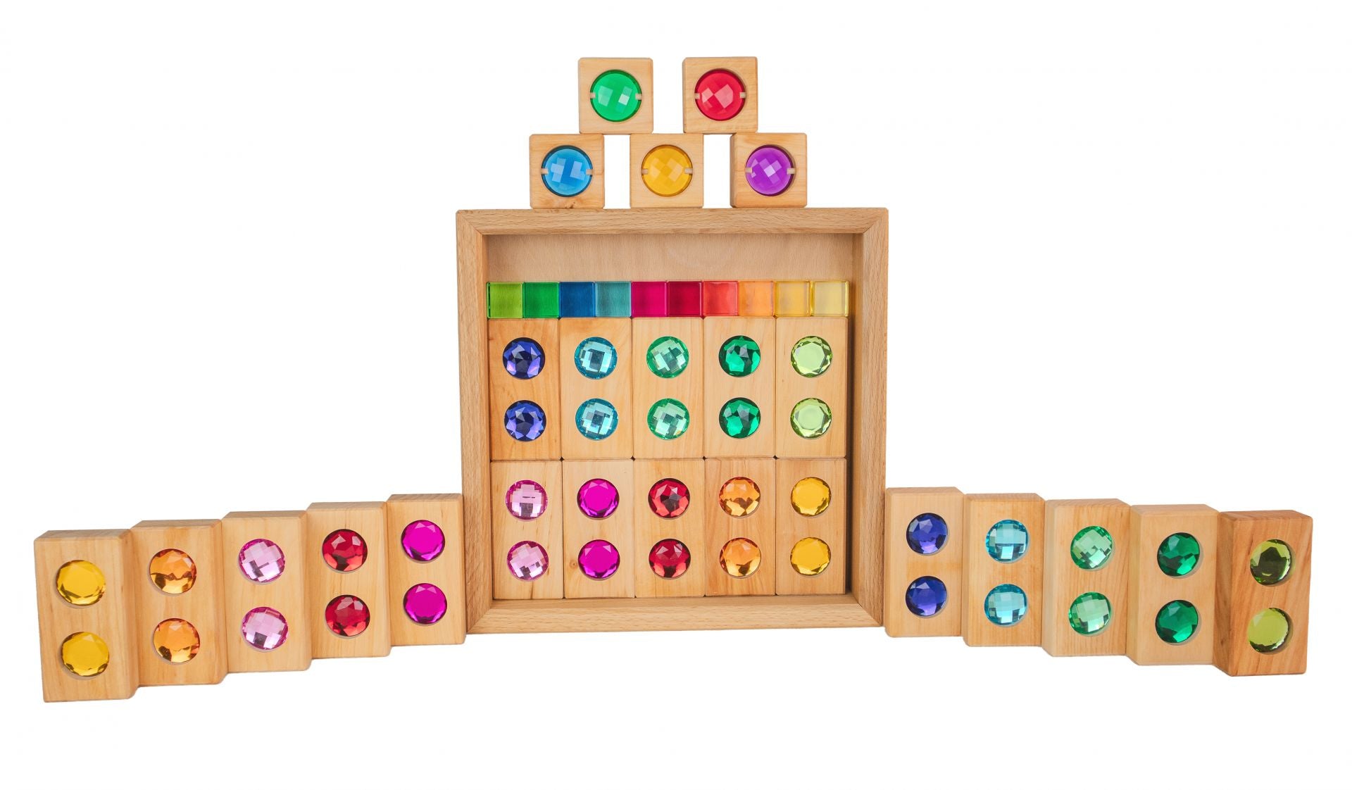 Das Bauset "Kleine Farbstrasse" mit Lichtbauwürfeln von Bauspiel ist ein Holzspielzeug, das große Spielfreude bereitet und das man ganz vielfältig kombinieren kann