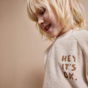 Kuschelig, verspielt und perfekt für kleine Entdecker: Das Terry Sweatshirt von Búho in zartem Ivory begeistert mit einem liebevollen Print-Motiv auf der Brust. Gefertigt aus weichem Frottee-Stoff (Terry), bietet es ein besonders angenehmes Tragegefühl. Die Raglanärmel sorgen für eine bequeme Passform, während Druckknöpfe am Rücken das An- und Ausziehen kinderleicht machen. Rippbündchen an Ärmeln, Kragen und Saum runden das Design ab – ein gemütlicher Alltagsbegleiter mit besonderem Charme.