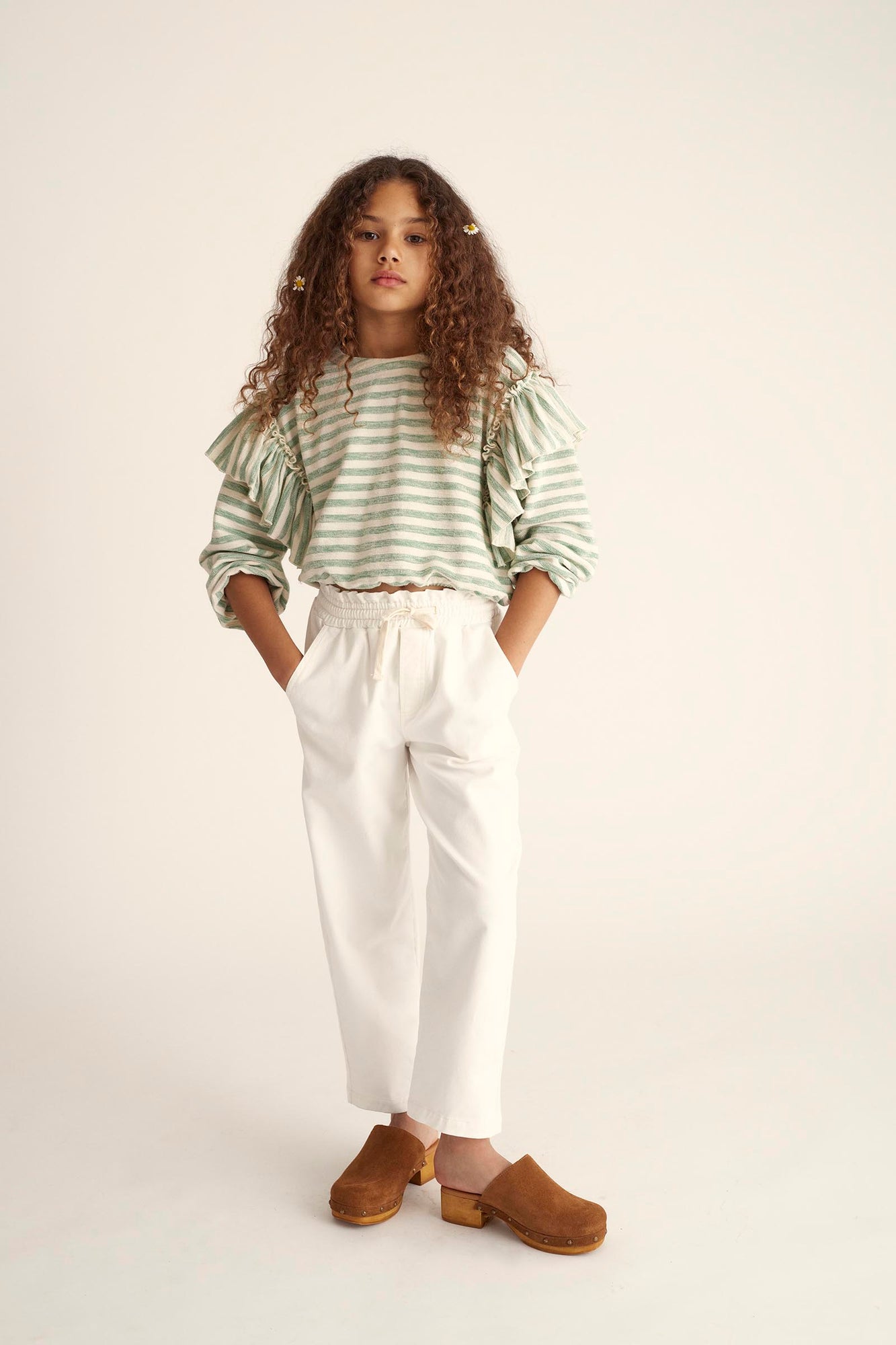 Wunderschönes Shirt von Cozmo das Komfort und Stil vereint, mit rustikaler Textur. Runder Halsausschnitt. Elastische Bündchen an Ärmeln und Saum. Volant entlang der Arme. All-over gewebte Streifen.