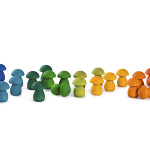 Das Grapat Mandala Rainbow Mushrooms Set besteht aus vielen kleinen, pilzförmigen Holzelementen in leuchtenden Regenbogenfarben. Sie eignen sich wunderbar zum Legen von Mandalas, zum Sortieren nach Farben oder zum Gestalten fantasievoller Spielwelten.