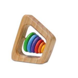 - 2-in-1 Babyspielzeug: Rassel und Beißring mit sechs bunten Holzscheibchen.