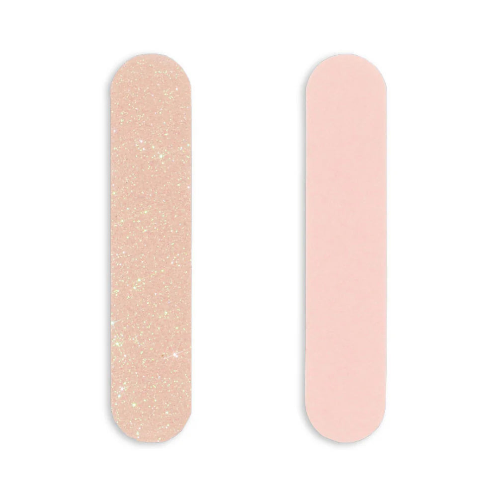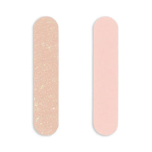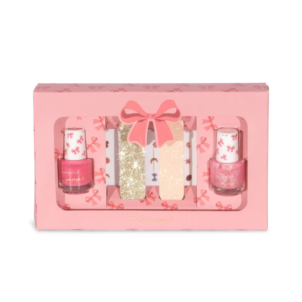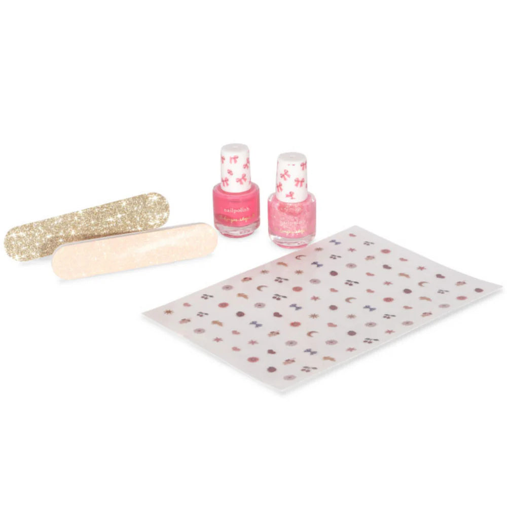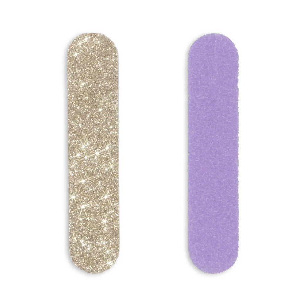 Das Set enthält zwei leuchtende Farben, eine Vollfarbe und eine mit Glitzer, Nagelaufkleber zum Gestalten lustiger Nagelkunst und eine glitzernde Nagelfeile, die speziell für kleine Hände entwickelt wurde.