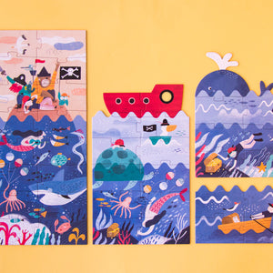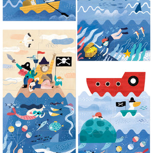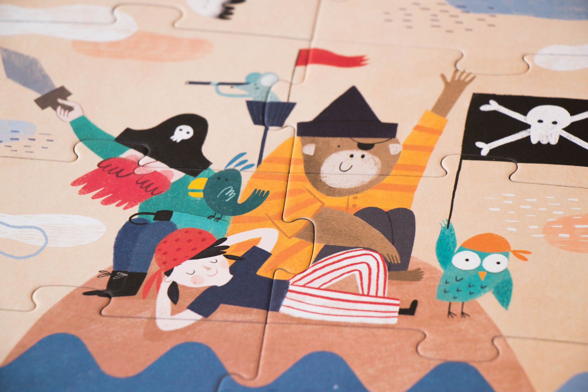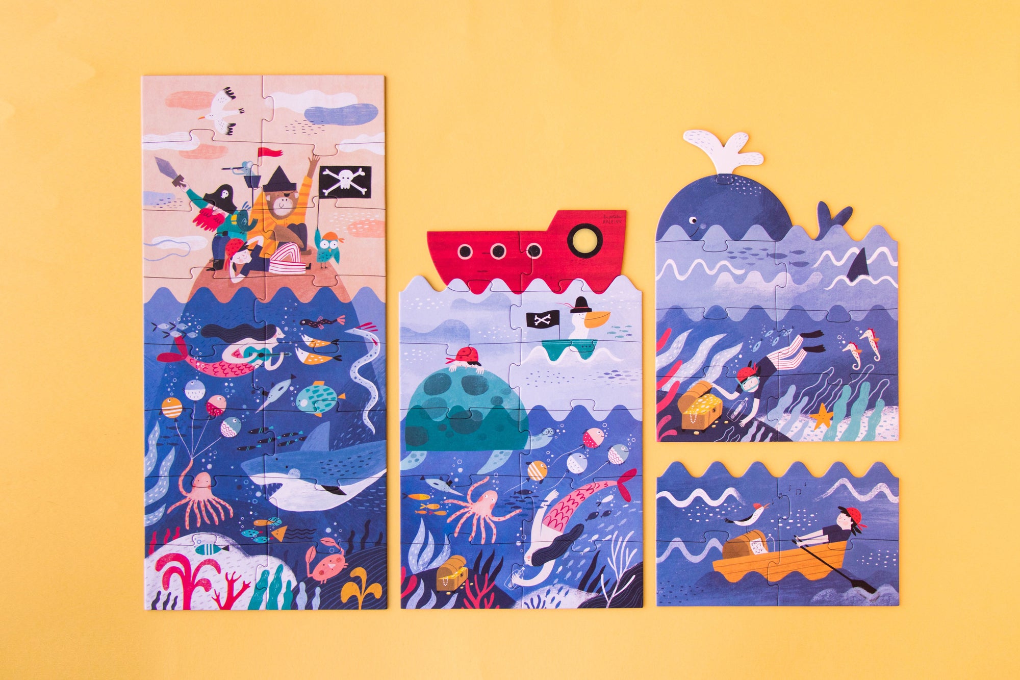 Das perfekte Puzzle "Discover the treasure" LONDJI begeistert groß und klein. Es erzählt die Geschichte von einer abenteuerlichen Schatzsuche. Was hat die Meerjungfrau wohl für eine Nachricht in der Flasche hinterlassen? Finde es gemeinsam mit den Piraten heraus. Das besondere an dem Puzzle ist neben den wunderschönen Bildern, dass es aus insgesamt vier Puzzeln besteht die aufeinander gelegt eine tolle Geschichte erzählen. Damit auch die kleinsten wissen welche Puzzleteile zusammengehören haben sie auf der Rückseite entsprechend die selbe Farbe. Ein wunderschönes Puzzle mit einer ebenso wunderschönen Verpackung.
