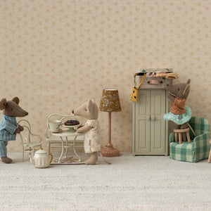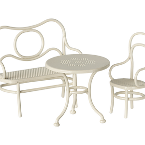 Das Café-Möbel Set 'Maus' von Mailegbietet der Mäusefamilie einen gemütlichen Platz für den Nachmittagskaffee. Bestehend ist das Set aus einer Bank, Tisch und einem Stuhl. Es passt perfekt in das Mäusehaus.