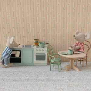 Jedes Maileg-Zuhause braucht eine Küche, und diese Miniatur-Theke ist ein wahrhaft wunderbarer Anfang. In einem sanften, staubigen Blaugrün mit einem Antik-Finish bemalt, vermittelt sie das zeitlose Gefühl eines geliebten Familienerbstücks. Deine Mäuse können ihre winzigen Tassen in der echten Metallspüle abspülen, einen Fantasiekuchen im illustrierten Ofen überprüfen oder den kleinen grünen Topf auf dem Herd köcheln lassen. Die charmanten Details, von der gefliesten Arbeitsplatte bis zur Miniatur-Tomatendose im Regal, schaffen eine Kulisse für endloses Geschichtenerzählen und ruhige, glückliche Momente.