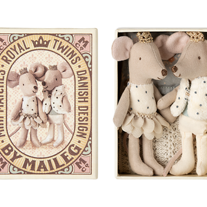 Die königlichen Zwillingsmäuse von Maileg wohnen in einer kleinen Streichholzschachtel, die sich nachts in ein fliegendes Märchenschloss verwandelt. Mit goldenen Kronen und glitzernden Gewändern bringen Prinz und Prinzessin Maus Magie, Mut und Träume ins Kinderzimmer – bereit für jedes Abenteuer im Reich der Fantasie.
