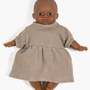Minikane Puppenkleid „Faustine“ Moka aus Baumwollgaze – mit Ballonärmeln für 28 cm Minikane Babies.