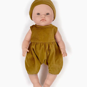 Die süße Puppe "Octave" von Minikane mit braunen Augen, ist ein bezaubernder Begleiter für Kinder. Mit festem Körper, beweglichen Armen und Beinen. Octave trägt ein Noa-Strampler aus Samt und seine Tico-Mütze aus hellbraunem Jersey.